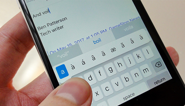 เวลาที่ต้องการพิมพ์ตัวอักษรพิเศษ ให้แตะค้างที่ตัวอักษร มันจะขึ้นตัวเลือกมาให้ จากนั้นเราก็เลื่อนปลายนิ้วไปที่ตัวอักษรที่ต้องการก็เป็นอันเรียบร้อยครับ