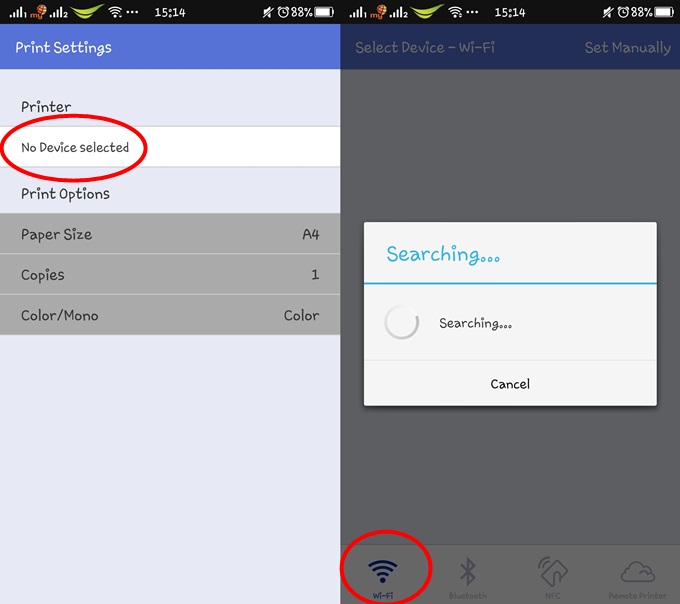 และกดไอคอนฟันเฟืองที่อยู่ด้านล่าง แล้วกดตรง No Device Selected สามารถเลือกได้ว่าต้องการเชื่อมต่อแบบไหน แล้วโปรแกรมจะค้นหา หาอุปกรณ์เชื่อมต่อได้ พอเรากดเลือกอุปกรณ์แล้วกลับไปที่หน้าสั่งปริ้นเพื่อกดปริ้นภาพ แค่นี้เครื่องปริ้นก็จะทำการปริ้นภาพที่เราต้องการออกมาได้ง่ายๆ
