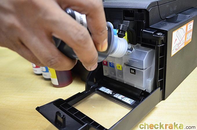 - Minimizes Ink Spillage ลดปัญหาการทำหมึกหกเลอะเทอะ ด้วยดีไซน์พิเศษ แค่เปิดฝาแท็งก์แล้วเอียงขวดทำมุม 45 องศา. ก็สามารถเติมหมึกได้จนหยดสุดท้าย