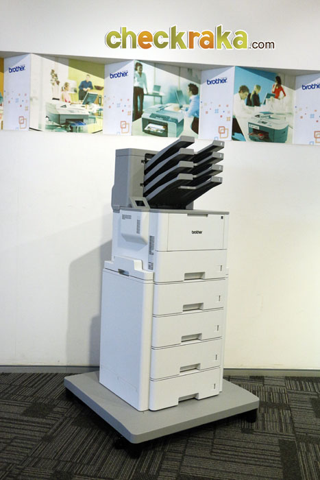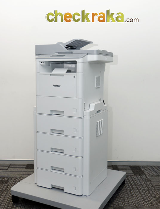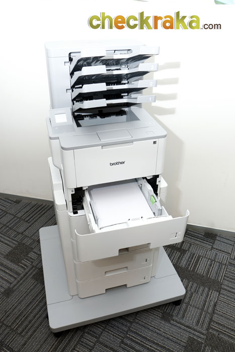 MFC-L6900DW ใส่อุปกรณ์เสริม Tower tray TT-400 เข้าไปก็จะมีน้ำหนักมากขึ้น แต่ก็เคลื่อนย้ายไปมาได้สะดวก เพราะมีล้อทางด้านล่าง นอกจากนั้น การที่ต่อ Tower tray TT-400 เข้ากับตัวเครื่อง ยังช่วยในเรื่องของการพิมพ์อย่างมาก รองรับการใส่กระดาษพิมพ์ได้สูงสุด 2600 แผ่น (520 x 5 ชั้น) อีกทั้งยังกำหนดรูปแบบการพิมพ์ของแต่ละชั้นได้อีกด้วย