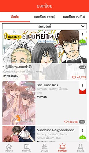 4. ยอดนิยม : ชาร์ตจัดอันดับความยอดนิยมของการ์ตูนในแต่ละเรื่อง แบ่งออกเป็น ยอดนิยมรายวัน รายสัปดาห์ และรายเดือน อีกทั้งยังมีการแบ่งการ์ตูนที่ได้รับความนิยมในหมู่หนุ่มๆ สาวๆ อีกด้วย
