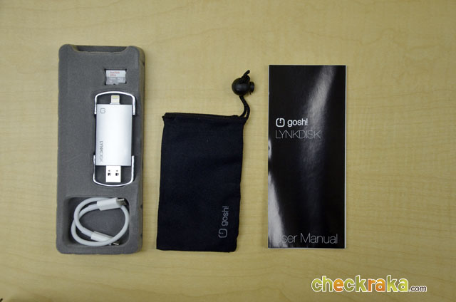 ภายในกล่องของ gosh! LynkDisk มาพร้อมกับตัวเครื่อง คู่มือการใช้งาน ถุงผ้ากำมะหยี่ สาย USB และมี MicroSD Card ขนาด 16GB แถมมาให้ ซึ่งถ้าคุณอยากได้หน่วยความจำมากกว่านี้ (รองรับสูงสุด 512GB) ก็ต้องซื้อเพิ่มเอาครับ