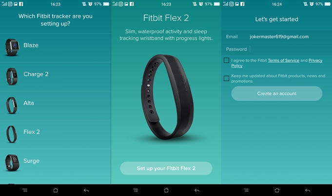 แอปพลิเคชั่น Fitbit ใช้งานง่ายมากครับ ขั้นแรกให้เลือกรุ่นอุปกรณ์ที่เราใช้งาน จากนั้นก็สมัครใช้งานด้วยอีเมล ใส่ข้อมูลสุขภาพ จากนั้นก็สนุกกับ Fitbit Flex 2 กันได้เลย โดยจะมีการแจ้งเตือนต่างๆ รายงานมายังอีเมลของเราอีกด้วย