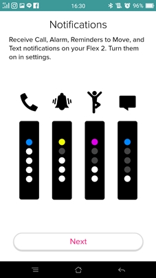 โดยจะมีสัญญาณไฟแสดงสีสันแตกต่างกัน รวมทั้งรองรับระบบสั่นด้วยในการแจ้งเตือน และสามารถใช้ Fitbit Flex 2 ในการตั้งเวลาปลุกได้