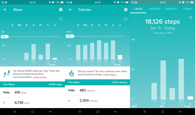 หน้าตาเมนูตรวจจับการนับก้าว โดยจะมีเป้าหมายที่เรากำหนดเอาไว้เป็นเกณฑ์ เพื่อเอาไว้ตรวจดูว่าแต่ละวันเราสามารถออกกำลังได้ตามเป้าที่วางเอาไว้หรือเปล่า เผาผลาญแคลอรี่ไปแค่ไหน มันช่วยกระตุ้นให้อยากออกกำลังมากขึ้นจริงๆ ครับ แถมยังสามารถควบคุมการกินของเราได้อีกด้วย และมีจำนวนรวมเก็บสถิติให้เราอย่างละเอียดเป็นรายอาทิตย์, รายเดือน, ราย 3 เดือน และรายปี
