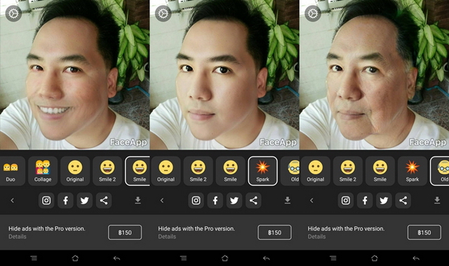 แอปพลิเคชั่น FaceApp มีให้ดาวน์โหลดทั้ง Android และ iOS มีลูกเล่น ได้แก่ Duo (ภาพเทียบกัน 2 ภาพ), Collage (ภาพเทียบกัน 4 ภาพ), Original (ภาพดั้งเดิม), Smile (ภาพรอยยิ้ม), Smile 2 (ภาพรอยยิ้มแบบที่ 2), Spark (ภาพแต่งให้ดูดีกว่าเดิม), Old (ภาพคนแก่), Young (ภาพเด็ก), Female (ภาพผู้หญิง), Male (ภาพผู้ชาย) โดยเราสามารถถ่ายภาพขึ้นมาใหม่ หรือใช้ภาพในสมาร์ทโฟนของเราก็ได้ และสามารถนำไปแชร์สู่แอปพลิเคชั่น Social ที่เราใช้งาน หรือจะเลือกบันทึกเก็บไว้บนสมาร์ทโฟนของเราเท่านั้นก็ได้ครับ