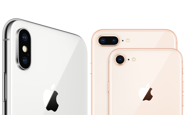 iPhone X และ iPhone 8 Plus มาพร้อมกล้องคู่ แต่จะมีความแตกต่างในเรื่องรายละเอียด โดย iPhone X มาพร้อมด้วยกล้องคู่ความละเอียด 12MP ค่ารูรับแสง F1.8 (กล้องมุมกว้าง) + 12MP ค่ารูรับแสง F2.4 (กล้องเทเลโฟโต้) ในขณะที่ iPhone 8 Plus มาพร้อมกล้องคู่ความละเอียด 12MP ค่ารูรับแสง F1.8 (กล้องมุมกว้าง) + 12MP ค่ารูรับแสง F2.8 (กล้องเทเลโฟโต้) พร้อมฟีเจอร์กล้องใหม่ๆ อย่าง Portrait Lighting เป็นการพัฒนาให้ฟีเจอร์ Portrait Mode ดูโปรมากยิ่งขึ้น ด้านรุ่นเล็กสุดอย่าง iPhone 8 จะมีกล้องตัวเดียวความละเอียด 12MP ค่ารูรับแสง F1.8