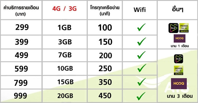 ทางด้าน AIS นั้นจะเป็นโปรโมชั่น 4G Full Speed Non-Stop เริ่มต้นที่ 299 ไปจนถึง 999 บาทต่อเดือน สิทธิ์ที่จะได้คือบริการ 4G/3G และเมื่อใช้ครบตามปริมาณที่กำหนด แพ็กเกจ 299, 399, 499 และ 599 จะสามารถเล่นเน็ตต่อเนื่องที่ความเร็วสูงสุด 128 Kbps. และแพ็กเกจ 799 และ 999 สามารถเล่นเน็ตได้ต่อเนื่องที่ความเร็วสูงสุด 384 Kbps และโทรฟรีทุกเครือข่ายตั้งแต่ 100 นาทีขึ้นไปจนถึง 450 นาที ขึ้นอยู่กับโปรที่เราเลือกเช่นกัน และใช้ Wifi AIS ได้ไม่จำกัด ที่สำคัญทาง AIS ก็ยังมีบริการพิเศษสำหรับลูกค้าที่สมัครแพ็กเกจ 4G Full Speed Non-Stop จะได้รับสิทธิ์ดูหนังและทีวีฟรี ผ่าน AIS PLAY, Premier FULL HD และ HOOQ พร้อมเน็ตไม่จำกัดโดยไม่หักเน็ตจากแพ็คเกจดังนี้ แพ็คเกจ 299 - 399 รับสิทธิ์นาน 1 เดือน และแพ็คเกจ 499 - 999 รับสิทธิ์นาน 3 เดือน