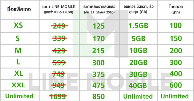 ถือว่าเป็นบริการโทรศัพท์มือถือน้องใหม่ที่น่าจับตามองมากๆ สำหรับ Line Mobile เพราะเมื่อเทียบราคาปกติกับเจ้าอื่นๆ แล้วก็ถือว่าถูกกว่าจริงๆ ซึ่งตอนนี้ กำลังมีโปรโมชั่นย้ายค่าย หรือเพียงแค่เปิดซิมใหม่กับ Line Mobile ก็รับส่วนลดไปเลย 50% ระยะเวลา 12 เดือน ตั้งแต่วันนี้จนถึงวันที่ 31 ตุลาคม แถมเราจะเลิกใช้เมื่อไหร่ก็ได้ เพราะว่าไม่มีสัญญาผูกมัด 12 เดือน เหมือนเจ้าอื่นๆ อีกด้วย โดยในส่วนของแพ็คเกจของ LINE MOBILE จะทำให้เข้าใจง่ายๆ ไม่ซับซ้อน โดยจะมี 7 แพ็คเกจด้วยกัน คือ XS, S , M , L , XL, XXL และ Unlimited โดยเริ่มจากแพ็คเกจ XS ที่ค่าบริการอยู่ที่ 249 บาทต่อเดือน หากได้ส่วนลด 50% จะอยู่ที่ 125 บาทเท่านั้น แต่ยังได้อินเตอร์เน็ต 1.5GB และโทรฟรี 100 นาทีอีกด้วย ส่วนแพ็คเกจสูงสุดคือ Unlimited ค่าบริการรายเดือน 1699 บาท หากได้ส่วนลด 50% ก็จะอยู่ที่ 850 บาท ได้อินเตอร์เน็ตและโทรฟรีแบบ Unlimited สมชื่อแพ็คเกจจริงๆ