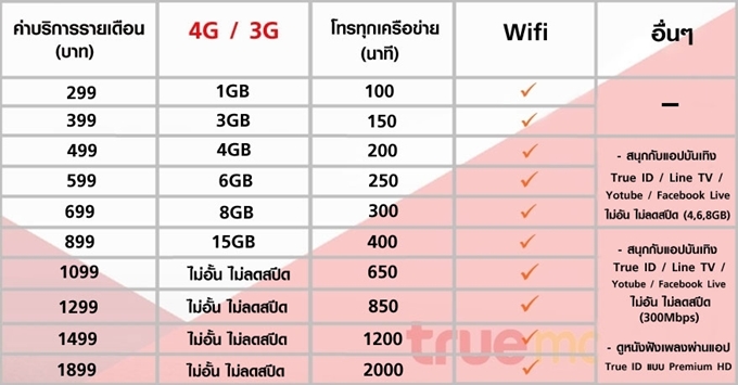 ในส่วนของค่าย Truemove H นั้นจะมีโปรโมชั่น 4G+Fun Unlimited เป็นแบบรายเดือนเริ่มต้นที่ 299, 399, 499 ไปจนถึง 1899 บาทต่อเดือน สิทธิ์ที่ได้ก็จะมี บริการ 4G ที่ความเร็วสูงสุด 300 เมกะบิตต่อวินาที (Mbps) และบริการ 3G ความเร็วสูงสุด 42 เมกะบิตต่อวินาที (Mbps) เป็นจำนวนกี่ GB ขึ้นอยู่กับว่าเราเลือกโปรอะไร ซึ่งหลังจากนั้น จะสามารถใช้ได้ไม่จำกัดปริมาณที่ความเร็วสูงสุดไม่เกิน 128 กิโลบิตต่อวินาที (Kbps) และยังโทรฟรีทุกเครือข่ายตั้งแต่ 100 นาทีขึ้นไปจนถึง 2,000 นาที ขึ้นอยู่กับโปรที่เราเลือกเช่นกัน และยังสามารถใช้ Wifi True ได้ไม่จำกัด นอกจากนี้หากเป็นโปร 4G+Fun Unlimited 499 ขึ้นไปจะได้รับบริการพิเศษคือ สนุกกับแอปบันเทิง True ID / Line TV / Yotube / Facebook Live และดูหนังฟังเพลงผ่านแอป True ID แบบ Premium HD