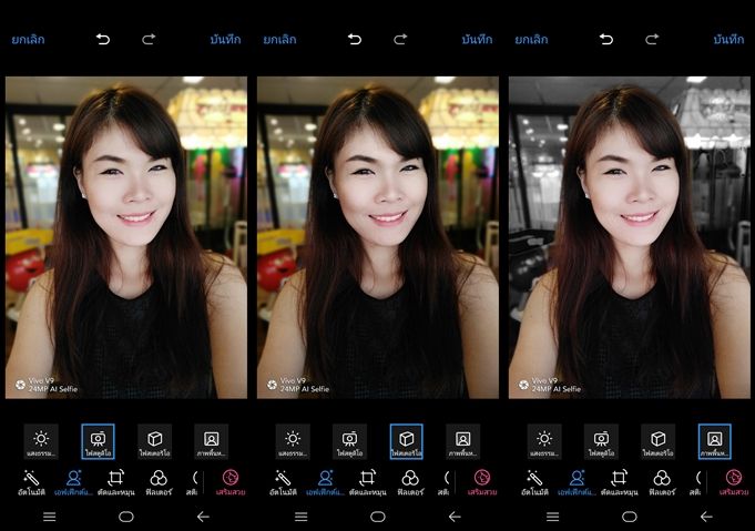 Vivo V9 มาพร้อมฟีเจอร์ AI Selfie Lighting ด้วยนะครับ โดยจะอยู่ในฟีเจอร์การปรับแต่งภาพ วิธีเปิดใช้งานพอเราถ่ายภาพเสร็จเวลาดูภาพในอัลบั้ม ให้เราเปิดดูรูปและเลือกคำสั่ง "แก้ไข" ที่อยู่ด้านล่าง จากนั้นเลือก "เอฟเฟ็กต์แสง" จะมีลูกเล่นให้เลือก 4 แบบได้แก่ แสงธรรมชาติ, ไฟสตูดิโอ, ไฟสเตอริโอ และภาพพื้นหลังขาว-ดำ ผลลัพธ์ที่ออกมาทำได้ดีทีเดียวครับ สวยมากๆ (มีเฉพาะในกล้องหน้าเท่านั้น)