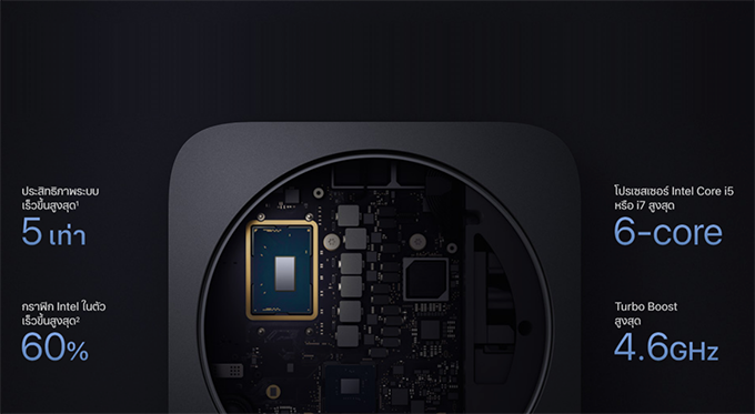 หน่วยประมวลผล Intel Core 8th Gen แบบ 4-core และ 6-core : Mac mini (2018) ใช้โปรเซสเซอร์ Intel Core รุ่นที่ 8 แบบ 6-core และ 4-core พร้อมความเร็ว Turbo Boost สูงสุดที่ 4.6Ghz และระบบกราฟิก Intel UHD Graphics 630 และหน่วยความจำสูงสุด 64GB ความเร็ว 2,666 Mhz ทำให้สามารถโหลดไฟล์ขนาดใหญ่เข้าไปในหน่วยความจำหรือควบคุมชุดข้อมูลที่มีขนาดใหญ่ขึ้นได้ พร้อมตัวจัดเก็บข้อมูลแบบ SSD ชนิด PCIe ความจุสูงสุด 2TB