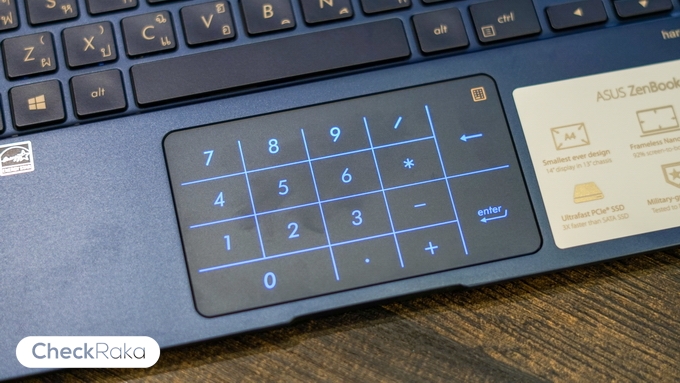 Touchpad ที่สามารถเปิดใช้งานเป็น Number Pad แบบระบบสัมผัส ซึ่งจะแสดงผลเป็นไฟ LED สีน้ำเงิน ดูสวยงามมากๆครับ สามารถเปิด-ปิดได้โดยแตะที่บริเวณเครื่องหมายตรงด้านขวาของ Touchpad โดยระหว่างที่เปิดใช้งานเป็น Number Pad ก็ยังคงใช้งานเคอร์เซอร์ได้เหมือนเดิม