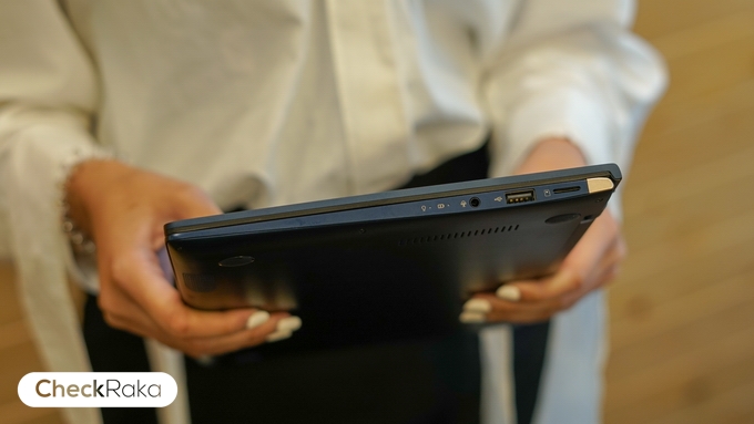 ด้านขวาประกอบด้วย ไฟแจ้งเตือน, ไฟแจ้งสถานะแบตเตอรี่, mic/headphone, USB-A 2.0, microSD card-reader (เป็นมาตรฐานใหม่บน Ultrabook แล้วละครับ คนที่ใช้งาน SD Card ต้องใช้ Card Reader เพิ่มเติม)