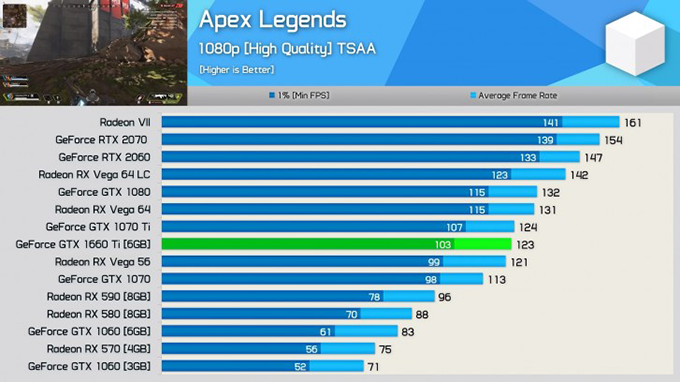 โดยจากการรีวิวเบื้องต้นด้วยเกมที่กำลังฮิตบน PC อย่าง APEX Legend นั้น พบว่า GTX 1660 Ti ให้ประสิทธิภาพในการประมวลผลด้านกราฟฟิกของเกมชนะ Radeon RX 980 ตัว RAM 8GB และให้ประสิทธิภาพที่ใกล้เคียงกับ GTX 1070 ที่เป็นการ์ดจอรุ่นฮิตของเกมเมอร์ ในราคาถูกกว่ากัน