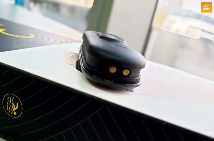 ด้านบนมีพอร์ทแบบ PIN สำหรับชาร์จไฟ ซึ่งจะใช้งานร่วมกับที่ชาร์จที่แถมมาให้ในกล่อง