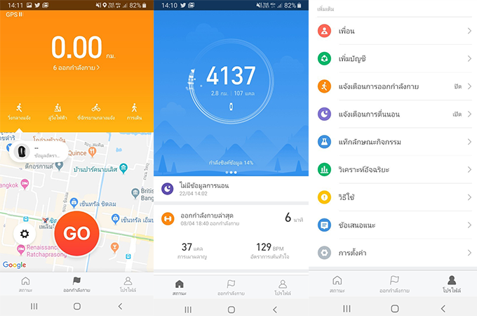 นอกจากนี้ภายในแอปฯ ยังมีเมนูโหมดการใช้งานต่างๆ ให้เลือกเรียกใช้ได้ตามต้องการ เช่น โหมดการออกกำลังกายที่จะรูปแบบกิจกรรมให้เราเลือก พร้อมมีแผนที่แสดงให้ดู รวมถึงโหมดการจับอัตราการเต้นของหัวใจ ระยะทาง หรือเวลาให้อัตโนมัติ หรือจะปรับแต่งตัว Mi Band 3 ให้แสดงผลรูปแบบต่างๆ เปิด-ปิดการตรวจจับการนอน และอื่นๆ อีกหลายฟังก์ชั่น ซึ่งเราสามารถเรียกใช้จากในแอปพลิเคชั่นได้เลย