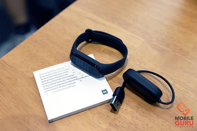 Mi Smart Band 4 บรรจุมาในกล่องสี่เหลี่ยมทรงยาว แบน แบบเดียวกับ Mi Band 3 ขนาดเล็กกะทัดรัดตามสิ่งของที่อยู่ภายในกล่อง ซึ่งก็มีแค่ตัวเครื่องพร้อมสายรัด สายชาร์จ แล้วก็สมุดคู่มือการใช้งานเท่านั้นเอง