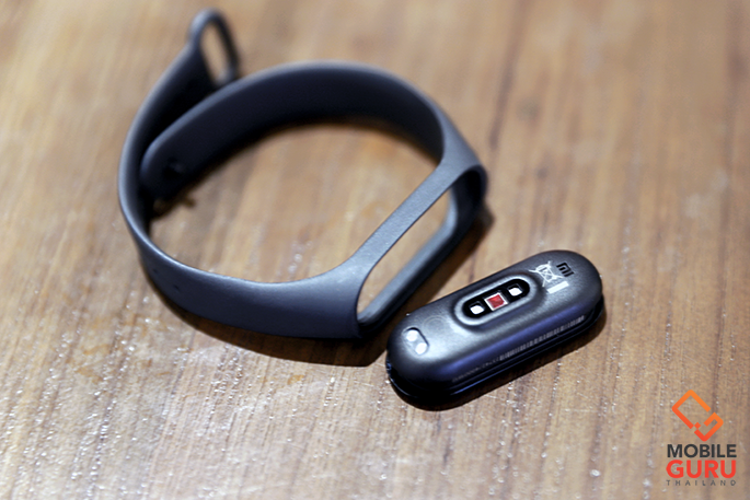 ด้านหลังมีเซ็นเซอร์จับอัตราการเต้นของหัวใจและตรวจจับการนอนหลับ, เซ็นเซอร์ Accelerometer แบบ 3 แกน และเซ็นเซอร์ Gyroscope แบบ 3 แกน พร้อมย้ายตำแหน่ง PIN สำหรับชาร์จแบตเตอรี่มาไว้ที่ด้านหลังด้วย ส่วนตัวสายรัดทำมาจากยางเทอร์โมพลาสติก โพลียูรีเทน ดีไซน์เหมือนเดิม ใส่กระชับข้อมือ และแน่นหนาดีเหมือนเดิมเช่นกัน สามารถปรับขนาดได้ตั้งแต่ 155 - 216 มิลลิเมตร ซึ่งตัวสายรัดนี้นอกจากสีดำก็มีสีอื่นๆ ให้เลือกเปลี่ยนได้ด้วยนะ (แอบถอดยากนิดนึง) ใครเบื่อสายเดิมๆ ก็ไปหาซื้อเพิ่มกันได้ ตัวนี้เป็นออปชันเสริม สำหรับเพิ่มความคูลนั่นเอง อ้อ! ถอดเอาไปใส่กับ Mi Band 3 ได้ด้วยนะ