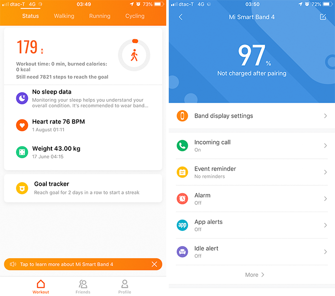 สำหรับหน้าตาของแอปพลิเคชัน Mi Fit ก็จะแบ่งออกเป็น 3 ส่วน คือ การออกกำลังกาย (Workout), เพื่อน (Friends) และ โปรไฟล์ (Profile) โดย Mi Smart Band 4 จะทำหน้าที่ในการบันทึกการเคลื่อนไหว กิจกรรมต่างๆ ของเราในแต่ละวัน และในแอปฯ Mi Fit นี้ จะแสดงให้เห็นข้อมูลต่างๆ ทั้งก้าวเดิน ระยะทาง การเผาผลาญแคลอรี่ อัตราการเต้นของหัวใจ และคุณภาพในการนอนหลับ รวมไปถึงการตั้งค่าต่างๆ เช่น การล็อกหน้าจอ แจ้งสายเรียกเข้า แจ้งเตือนกิจกรรม ตั้งค่าการปลุก และการตั้งค่าการสวมใส่ต่างๆ