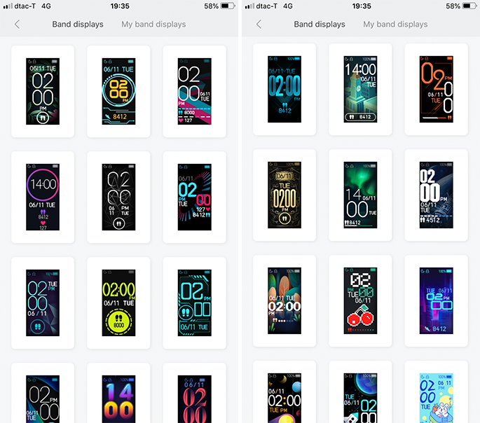 และที่เพิ่มเข้ามาอีกอย่างให้มีอะไรเพิ่มสีสันหน่อยก็คือ สามารถเปลี่ยน Displays หน้าจอพื้นหลังของ Mi Smart Band 4 ได้ มีแบบให้เลือกเยอะมาก ตั้งแต่น่ารักมุ้งมิ้งไปจนถึงแนวเท่ๆ ชอบอันไหนก็กดเลือกเปลี่ยนได้เลย เสียดายที่ยังเอารูปของเราไปใส่หรือ Custom เองยังไม่ได้ ไม่งั้นน่าจะสนุกกว่านี้