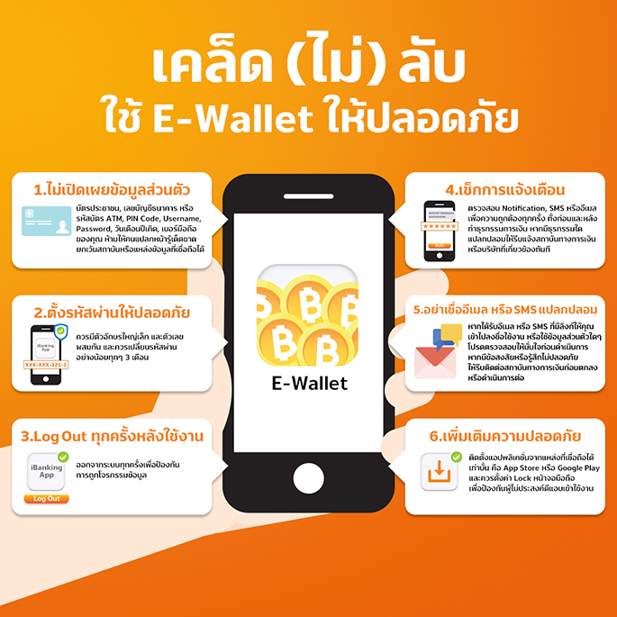 - ปลอดภัยในการทำธุรกรรม และตรวจสอบความเคลื่อนไหวทางบัญชีได้เสมอ สำหรับการทำธุรกรรมต่าง ๆ ใน e-Wallet ผู้ใช้บริการจำเป็นต้องทำการ log-in เพื่อเข้าใช้งานก่อนเสมอ ซึ่งระบบความปลอดภัยในส่วนนี้ e-Wallet ได้กำหนดให้จำเป็นต้องมีการกรอก Password, Pin, OTP และรวมถึงข้อมูลชีวมาตร (Biometrics) เช่น ใบหน้า ลายนิ้วมือของผู้ใช้บริการ หรือเจ้าของบัญชีเท่านั้น ที่เป็นผู้กำหนดและตั้งค่าด้วยตนเอง นอกจากขั้นตอนการเข้าใช้งานบัญชีแล้ว ขั้นตอนการทำธุรกรรม ก็มีความปลอดภัยเช่นกัน โดยจะมีระบบ Risk control, Risk system และ Authentication รูปแบบต่าง ๆ เช่น การขอให้ใส่รหัส Pin หรือ OTP ก่อนการโอนเงิน เป็นต้น ผู้ใช้บริการยังสามารถตรวจสอบรายการ (Transaction History) ได้แบบทันที (Online Real Time) จากในแอปฯ ทั้งนี้ หากได้รับข้อความเตือนแปลก ๆ ผ่านช่องทาง e-mail หรือ SMS หรือได้รับ OTP จากช่องทางใด ๆ เข้ามา เราไม่ควรรีบกดรับ หรือแจ้งรหัส OTP ที่ได้รับให้ผู้อื่นทราบ ตั้งสติให้ดีหากเราไม่ได้ทำธุรกรรมใด ๆ ตามที่ได้รับแจ้ง อาจเป็นไปได้ว่ามีใครได้ข้อมูลส่วนตัวของเราไปและพยายามเข้าถึงบัญชีของเรา
