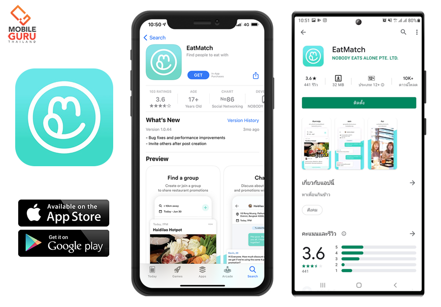 EatMatch คือแอปพลิเคชั่นสำหรับหาเพื่อนกิน ไม่ว่าจะกินข้าว กินขนม รึจะพากันเดินเล่นสบาย ๆ ก็สามารถใช้ EatMatch เป็นตัวช่วยได้ โดยผู้ใช้งานสามารถเข้าไปเลือกกลุ่มหรือปาร์ตี้ในแอปฯที่ตัวเองสนใจแล้วกดเข้าร่วม (Join) กลุ่มได้ หรือถ้าหากตัวเองมีไอเดียร้านอาหารอยู่ในใจอยู่แล้ว ก็สามารถสร้างกลุ่มหรือปาร์ตี้ขึ้นมาด้วยตัวเองเพื่อเชิญชวนคนอื่นมาจอยด้วยกันได้ สะดวกสบายจนคำว่า "เพื่อนกินหาง่าย" ไม่ได้เป็นเพียงสำนวนอีกต่อไป!