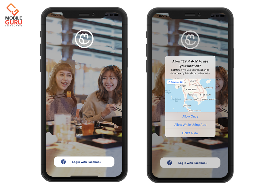 วิธีใช้งานของ EatMatch ก็แสนง่ายดายค่ะ เพียงแค่กดเข้าไปที่แอปพลิเคชั่น ล็อกอินด้วยบัญชีเฟสบุ๊ค (Login with FaceBook) จากนั้นก็เปิดโลเคชั่น (Location) ให้เรียบร้อย