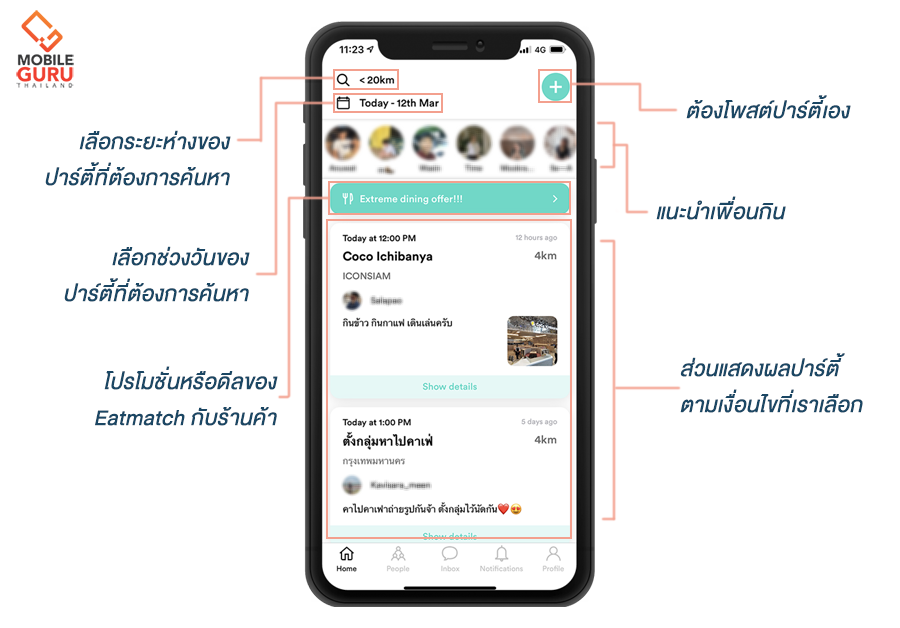 หน้าโฮม (Home) ของ EatMatch ทางซ้ายมือบนก็จะเป็นตัวเลือกให้เราเสิร์ชหากลุ่มหรือปาร์ตี้ที่เราอยากเข้าร่วม โดยอาศัยจากรัศมีรอบ ๆ ตัวตามที่เราเลือกไว้ และวันที่ที่ต้อง จากนั้นก็จะแสดงผลการค้นหาให้ทางด้านล่าง นอกจากนี้ยังมีในส่วนของโปรโมชั่นหรือดีลของ EatMatch กับร้านค้า ที่จะให้ส่วนลดพิเศษต่าง ๆ สำหรับผู้ใช้งานผ่านแอปฯเท่านั้น ซึ่งเราก็สามารถเข้าร่วมปาร์ตี้ส่วนลดเหล่านั้นได้เลยอีกด้วย แต่สำหรับใครที่มีไอเดียความอยากเป็นของตัวเองอยู่แล้ว ต้องการหาเพื่อนที่มีอุดมการณ์เดียวกันไปกินด้วย ก็สามารถกดสร้างโพสต์ปาร์ตี้ได้ด้วยตัวเองเลยที่ปุ่ม + มุมขวาบนค่ะ