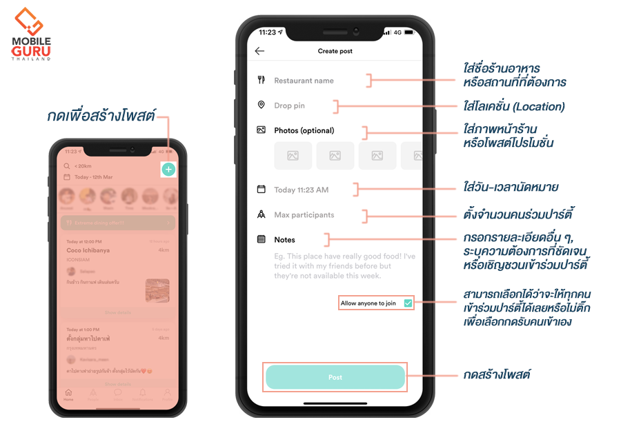 วิธีสร้างโพสต์กลุ่มหรือปาร์ตี้ก็ไม่ยากเลยค่ะ เพียงแค่กรอกรายละเอียดตามช่องให้ครบถ้วน สามารถระบุได้เลยว่าต้องการเพื่อนเพศไหน วัยไหน หรือมีโปรโมชั่นอะไร จะแชร์ค่าอาหารกันอย่างไร กระทั่งอยากชวนกันไปเดินเล่นต่อ ก็สามารถใส่ลงไปได้เพื่อประกอบการตัดสินใจ จากนั้นก็กดโพสต์ (Post) และรอเพื่อน ๆ เข้ามาร่วมกลุ่ม