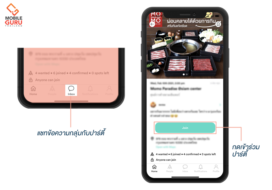 เมื่อสร้างกลุ่มปาร์ตี้เสร็จ และมีเพื่อน ๆ เข้ามาจอยกันพร้อมหน้าแล้ว ก็สามารถพูดคุยกันได้ผ่านแชทกลุ่ม จะนัดแนะ นัดเจอ ตกลงเรื่องค่าอาหาร หรือคุยเล่นกันก่อนเจอหน้า ก็สะดวกสบายง่ายดายสุด ๆ แต่ถ้าหากรู้สึกว่าการเป็นหัวตี้มันวุ่นวาย ก็สามารถใช้ฟังก์ชั่นการเสิร์ชในหน้าโฮม เลือกปาร์ตี้ที่ต้องการแล้วกดเข้าร่วม (Join) ได้เลยจ้า