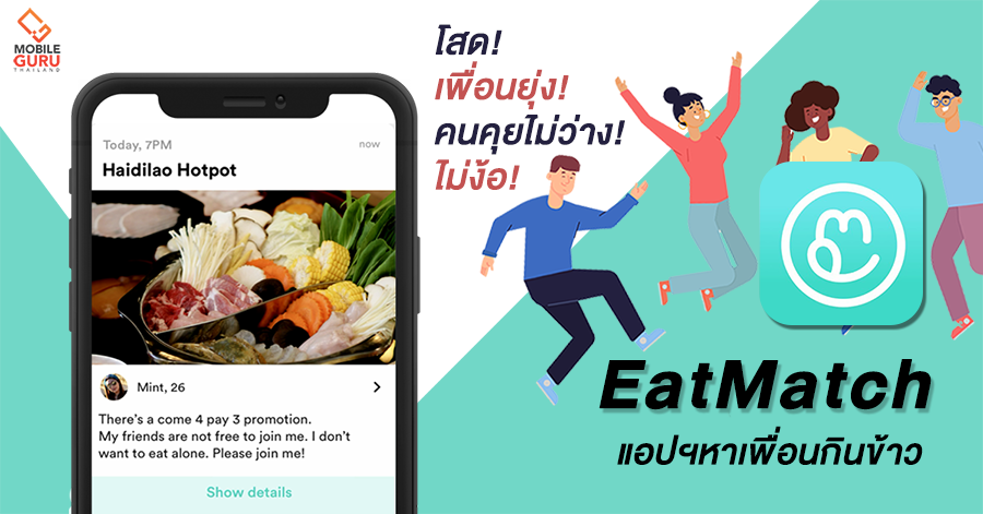 เทศกาลแห่งความรักใกล้เข้ามาทุกที ประจวบพอดีกับเป็นวันหยุดซะด้วย คนมีคู่ทั้งหลายคงวานแผนเที่ยวกันเรียบร้อยแล้ว ส่วนคนโสดอย่างเรา ๆ ก็ได้แต่เบะปาก ฮึ! นะคะ แต่ไม่ต้องห่วงค่ะ วันนี้โมบายกูรูมีทางออกให้คนไม่มีคู่ได้ออกไปลัลล้าเที่ยวเล่น กินข้าวได้โดยไม่ต้องง้อใครทั้งนั้น ไม่ว่าจะโสด! เพื่อนยุ่ง! คนคุยไม่ว่าง! ก็ไม่ใช่ปัญหาอีกต่อไป เพียงแค่มีแอปพลิเคชั่นเก๋ ๆ อย่าง "EatMatch (อีทแมทช์)"