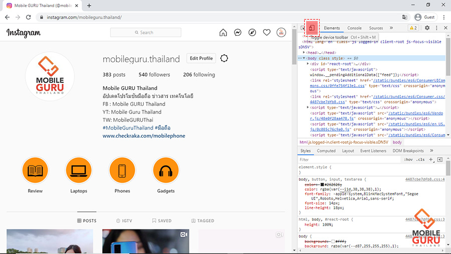 Step 4 : คลิกเปลี่ยนให้เป็นเวอร์ชั่น Mobile ตรงรูปมือถือด้านซ้ายสุดของแท็บ Elements