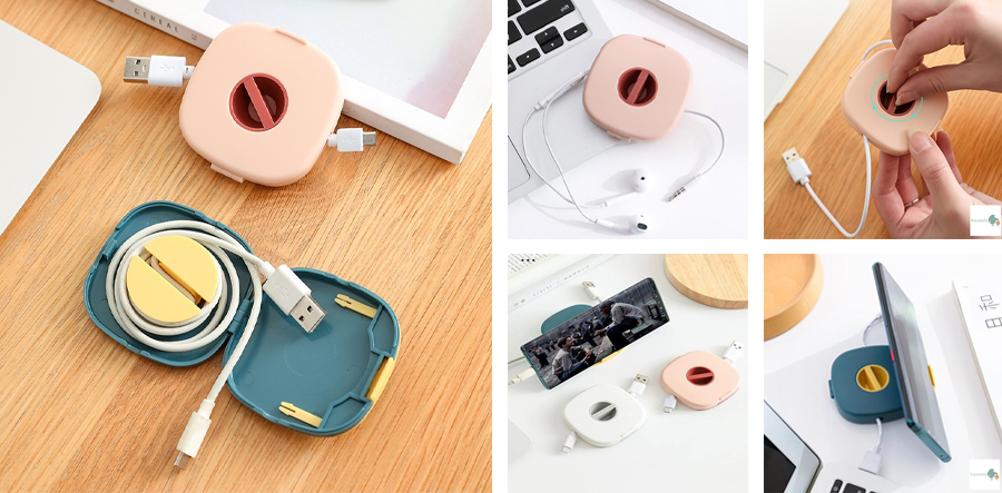 กล่องเก็บสายชาร์จ สายหูฟัง รุ่นหมุนอัตโนมืออีกหนึ่งรุ่น ในดีไซน์แบบตลับทรงสี่เหลี่ยมจตุรัสน่ารักมุ้งมิ้ง ขนาดกะทัดรัด พกพาง่าย และช่วยเก็บสายต่าง ๆ ไม่ให้พันกันได้เป็นอย่างดี นอกจากนี้ยังมากับฟังก์ชันเสริม สามารถดึงถาดรองออกมาสำหรับวางตั้งมือถือได้ด้วย จุดสังเกตุของรุ่นนี้คือเมื่อหมุนสายจนสุดแล้ว ตัวหูฟัง หรือหัวพอร์ตต่าง ๆ จะยังโผล่ออกมานอกตลับ ถ้าใครที่ซีเรียสกลัวเกิดรอยขีดข่วนก็แนะนำให้ลองมองแบบอื่น ๆ ดูนะ