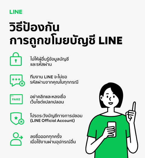 หลายคนคงเคยเจอการถูกขโมยบัญชีหรือบัญชีโดนแฮ็กจากบุคคลนิรนาม ปัญหาป้องกันเบื้องต้นได้ด้วยตัวเอง ตั้งแต่ไม่ให้ผู้อื่นรู้รหัสผ่าน ตั้งรหัสผ่านที่ยากต่อการคาดเดา เจ้าหน้าที่ของ LINE เองก็จะไม่ขอรหัสผ่านคุณทุกกรณี นอกจากนี้ อย่าเผลอคลิกลิงก์แปลกปลอมหรือหลงเชื่อ LINE Official Account ปลอม หากพบพิรุธสามารถกด "รายงาน" ในการตั้งค่าได้เลย และที่สำคัญ ลงชื่อออกเมื่อเข้าใช้งานจากอุปกรณ์อื่นเสร็จ