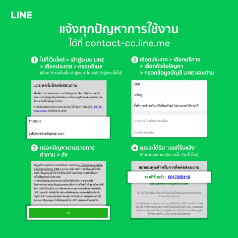 contact-cc.line.me คือที่ๆผู้ใช้ LINE จะสามารถติดต่อเพื่อรายงานปัญหาการใช้งาน LINE ในด้านต่าง ๆ โดยเมื่อเข้าไปแล้ว คุณจะต้องล็อกอินเข้าไปก่อน เพื่อรายงานรายละเอียดปัญหาในขั้นต่อไป กรณีหากบัญชีโดนแฮ็ก สามารถเลือกดำเนินการโดยไม่ต้องล็อกอิน (Continue without logging in) เมื่อรายงานปัญหาเสร็จ จะได้รับเลขที่รับแจ้ง ไว้สำหรับการดำเนินการและติดตามผล