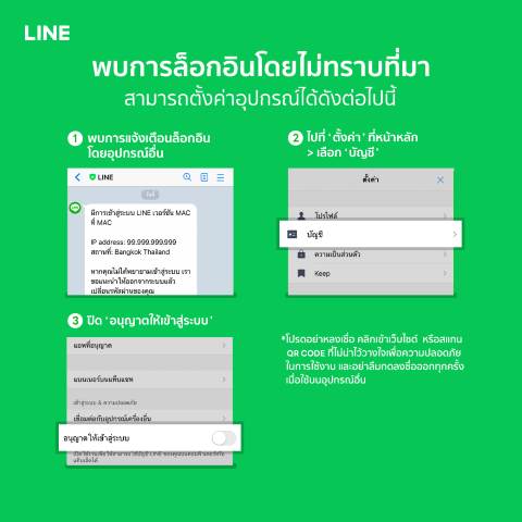 หลายครั้งเราใช้ LINE ผ่านบนอุปกรณ์อื่นที่ไม่ใช่มือถือเครื่องหลัก ทำให้เราอาจลืมล็อกเอาท์ หรืออาจถูกขโมยพาสเวิร์ดไปล็อกอินในอุปกรณ์อื่นๆ หากพบว่ามีการล็อกอินโดยไม่ทราบที่มา เราเองก็สามารถตั้งค่าปิดการอนุญาตให้เข้าสู่ระบบบนเครื่องอื่นได้ทันที อุปกรณ์อื่นที่ล็อกอินอยู่นั้นก็จะล็อกเอาท์ในทันใด