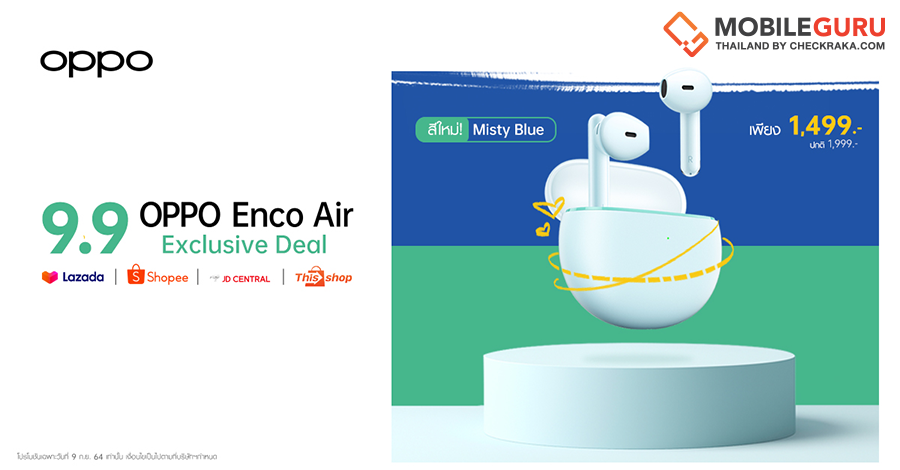 ห้ามพลาด! โปรโมชั่นพิเศษ ให้คุณเป็นเจ้าของ OPPO Enco Air สีใหม่ Misty Blue ในราคาสุดคุ้มเพียง 1,499 บาท จากปกติ 1,999 บาท เฉพาะแคมเปญ 9.9 บนช่องทางออนไลน์ ได้แก่ Shopee, Lazada, JD Central และ Thisshop ในวันที่ 9 กันยายน 2564 เท่านั้น
