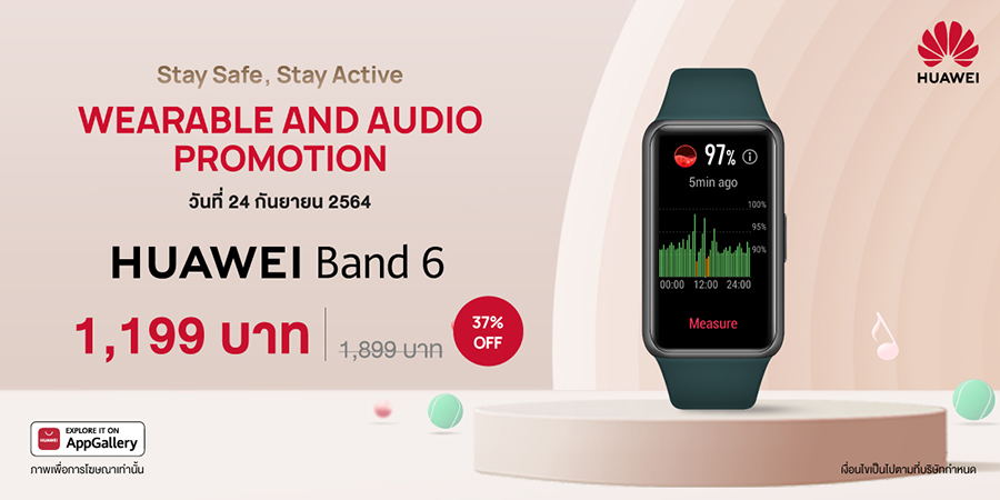 HUAWEI Band 6 สมาร์ทแบนด์ที่มาพร้อมหน้าจอขนาดใหญ่ 1.47 นิ้ว ชัดเต็มตาแบบ FullView ให้ความรู้สึกคล้ายหน้าจอสมาร์ทวอทช์ มาพร้อมโหมดออกกำลังกายที่จัดเต็มถึง 96 โหมด สามารถตรวจวัดอัตราการเต้นของหัวใจขณะออกกำลังกาย และวัดค่าความอิ่มตัวของออกซิเจนในเลือด (SpO2) ของผู้สวมใส่ในระหว่างออกกำลังกายได้ ดีไซน์โมเดิร์นโฉบเฉี่ยวสะดุดตา สวมใส่ได้ทุกโอกาส ใช้งานได้ต่อเนื่องยาวนานถึง 14 วัน ราคาพิเศษเพียง 1,199 บาท จากราคาปกติ 1,899 บาท พร้อมรับฟรีสายนาฬิกามูลค่า 399 บาท เมื่อสั่งซื้อสินค้าออนไลน์ผ่านทาง HUAWEI Store และร้านค้าอย่างเป็นทางการของหัวเว่ยบน Shopee และ Lazada ในวันที่ 24 กันยายน 2564
