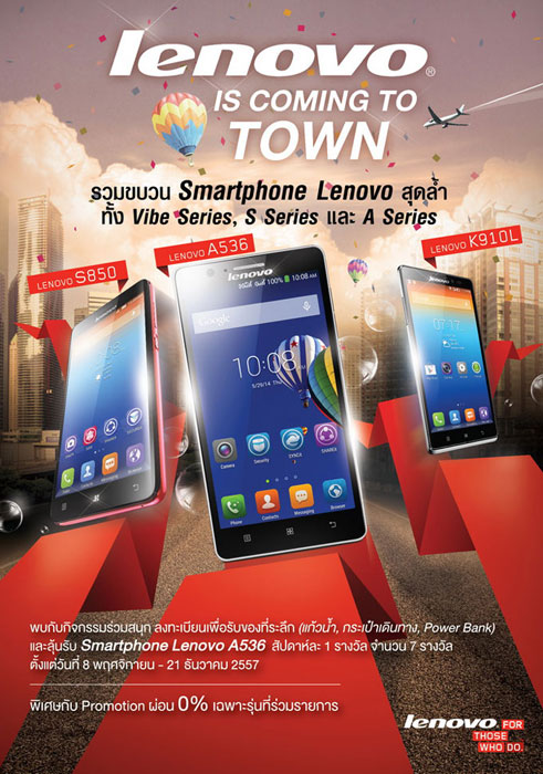 เลอโนโวผู้นำยอดขายคอมพิวเตอร์อันดับ 1 ของโลก ฉลองเทศกาลส่งท้ายสิ้นปี ยกขบวนสมาร์ทโฟนหลากหลายรุ่นมาจัดโปรโมชั่น พร้อมมอบโชคสมาร์ทโฟนเลอโนโว A536 ทุกสัปดาห์ ตั้งแต่วันนี้จนถึง 21 ธันวาคม 2557