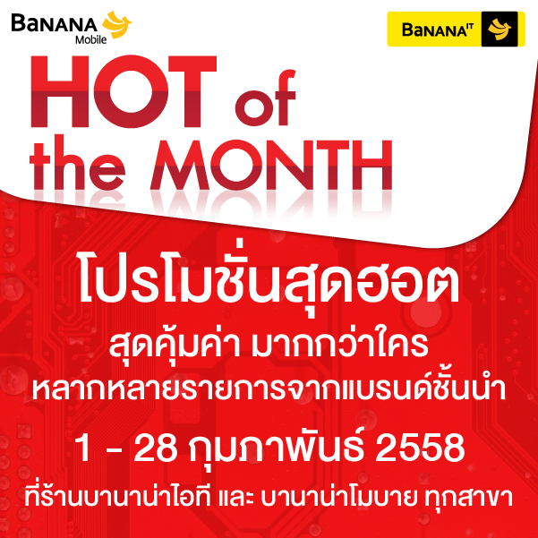 โปรโมชั่น Hot of The Month ประจำเดือนกุมภาพันธ์นี้ ฉลองต้อนรับตรุษจีนและเทศกาลแห่งความรักไปพร้อมๆ กันกับสินค้าไอทีราคาสุดพิเศษหลายแบรนด์ชั้นนำที่ให้คุณเป็นเจ้าของได้ง่ายๆ ทั้งโน๊ตบุ๊ค, อุปกรณ์คอมพิวเตอร์ประกอบ, สมาร์ทโฟน, แท็บเล็ต และสินค้า Accessory ต้อนรับความสุข เฮง เฮง เฮง กันถ้วนหน้า กับโปรโมชั่นดีๆ ที่ร้านบานาน่าไอที และร้านบานาน่าโมบาย ทุกสาขา ทั่วประเทศ ตั้งแต่วันที่ 1 กุมภาพันธ์ - 28 กุมภาพันธ์ 2558