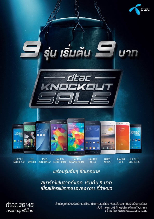 นางสาวปริศนา รัตนสุวรรณศรี ผู้อำนวยการอาวุโสสายงานธุรกิจโพสต์เพด บริษัท โทเทิ่ล แอ็คเซ็ส คอมมูนิเคชั่น จำกัด (มหาชน) หรือ ดีแทค กล่าวว่า จากผลสำรวจพฤติกรรมผู้ใช้สมาร์ทโฟนในปัจจุบันพบว่า 65% ของลูกค้าเปลี่ยนมือถือทุก ๆ 1 ปี และอีก 35% ของลูกค้ากลุ่มนี้เปลี่ยนมือถือทุกๆ 6 เดือน ดีแทคจึงเปิดตัวแคมเปญลดราคาสมาร์ทโฟนครั้งยิ่งใหญ่ภายใต้ชื่อว่า "ดีแทค น็อคเอาท์ เซล" เพื่อมอบส่วนลดราคาสมาร์ทโฟนให้กับลูกค้าปัจจุบัน ลูกค้าเปลี่ยนจากระบบเติมเงินเป็นระบบรายเดือน ลูกค้าย้ายค่ายเบอร์เดิม หรือ เปิดเบอร์ใหม่กับดีแทค โดยชู 9 รุ่นท็อปฮิตติดตลาด เริ่มต้นราคาที่ 9 บาทเท่านั้น ลูกค้าสามารถเป็นเจ้าของสมาร์ทโฟนได้ในราคาสุดคุ้ม เมื่อสมัครแพ็กเกจ Love & Roll เน็ต 3G/4G แรงเต็มๆ ไม่ลดสปีด ใช้ไม่หมดทบไปเดือนหน้าได้ นอกจากนี้ดีแทคยังให้ใช้แอปพลิเคชั่น Capture App ฟรี! เพื่อเพิ่มเนื้อที่เก็บรูปและวีดีโอ รองรับพื้นที่ฟรีสูงสุดถึง 100GB