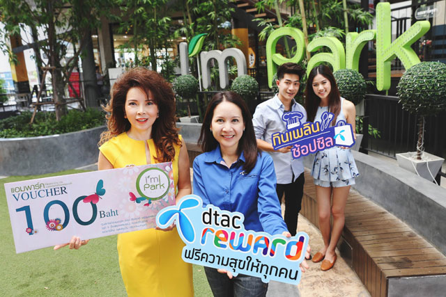 นางสาวเพ็ญพงา สุทธิมณฑล (ขวา) ผู้อำนวยการฝ่ายบริหารลูกค้า บริษัท โทเทิ่ล แอ็คเซ็ส คอมมูนิเคชั่น จำกัด (มหาชน) หรือ ดีแทค และ คุณสรันทิพย์ เลิศปัญญาโรจน์ (ซ้าย) กรรมการผู้จัดการ บริษัท แกรนด์ ยูนิแลนด์ จำกัด ร่วมกันมอบฟรีความสุขเฉพาะลูกค้าดีแทคและแฮปปี้ให้สิทธิพิเศษผ่านแคมเปญ "กินเพลิน ช้อปชิล" ที่ ศูนย์การค้า I'm Park (แอมพาร์ค) ไลฟ์สไตล์มอลล์แห่งใหม่ใจกลางสามย่าน