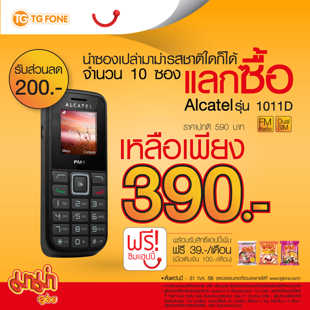 รายละเอียดเกี่ยวกับโปรโมชั่นซิมแฮปปี้ สำหรับผู้ที่นำซองมาม่า 10 ซอง มาแลกซื้อมือถือ Acatel รุ่น 1011D ราคา 390 บาทที่ TG FONE ระหว่างวันที่ 5 มิถุนายน - 31 กรกฎาคม 2558 รับสิทธิ์รับแฮปปี้ใช้ฟรี 39 บาทต่อเดือน (ใช้ได้นาน 5 วัน) เมื่อเติมเงินสะสม 100 บาทต่อเดือน