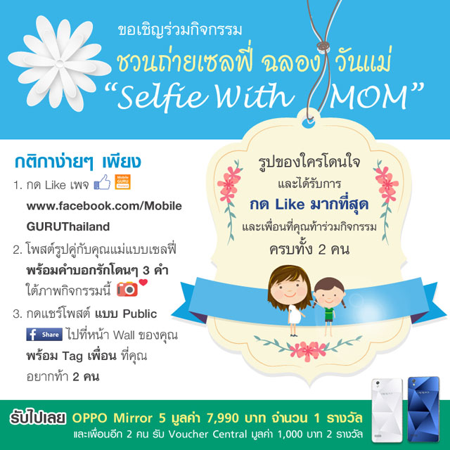 เช็คราคา.คอม ชวนคุณร่วมลุ้น!! OPPO Mirror 5 สมาร์ทโฟนดีไซน์หรูกับกิจกรรม "Selfie with mom"