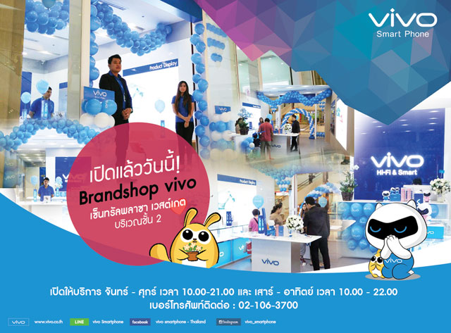 vivo เพิ่มช่องทางการบริการให้ลูกค้าชานเมืองด้วยการเปิดตัว vivo brand shop สาขา CentralPlaza WestGate ซึ่งภายในร้านสามารถเลือกซื้อ หรือลองเล่นสมาร์ทโฟนสุดเจ๋งจากทาง vivo ได้ทุกรุ่น พร้อมรับของแถมมากมาย เช่น เพาเวอร์แบงค์ เคสสวยๆ พร้อมทั้งยังมีบริการติดฟิล์ม, ติดตั้งแอปพลิเคชั่น รวมถึงศูนย์เซอร์วิสสำหรับสอบถามการใช้งาน และบริการซ่อมเครื่อง