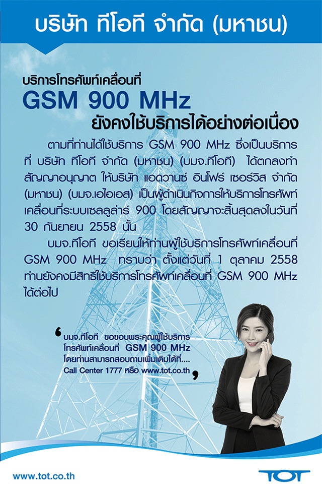 30 ก.ย. 58 742ทีโอทีชี้แจง บริการโทรศัพท์เคลื่อนที่ GSM 90 MHz ยังคงใช้บริการได้อย่างต่อเนื่อง