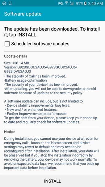 ซอฟต์แวร์ Version : G928GDDU2AOJ5 มีขนาดไฟล์ 138.14 MB โดยตอนนี้ได้ปล่อยให้ Samsung Galaxy S6 edge+ (Version Unlock) ในประเทศอินเดียและทวีปยุโรปได้ลองใช้งานไปก่อน และคาดว่าประเทศอื่นๆ อาจจะได้มีโอกาสอัพเดทกันเร็วๆ นี้ และจากการทดสอบหลังจากอัพเดทซอฟต์แวร์พบว่าการจัดการในด้านพลังงาน การใช้งานต่างๆ ดีขึ้น