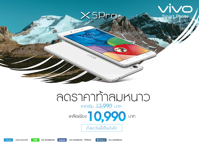vivo X5Pro สมาร์ทโฟนสุดทันสมัย ด้วยตัวเครื่องสุดสวยงาม รองรับการใช้งานอย่างครบครันทั้งกล้องคุณภาพขนาด 13 ล้านพิกเซล ให้ภาพคมชัดและลูกเล่นต่างๆ ช่วยคุณสร้างสรรค์การถ่ายภาพได้หลากหลายรูปแบบ พร้อมกล้องหน้าขนาด 8 ล้านพิกเซล นอกจากถ่ายภาพแล้วสเปคเครื่องก็ยังรองรับการใช้งานได้ทุกรูปแบบผ่านหน่วยประมวลผล Qualcomm Snapdragon 615 ความเร็ว 1.7 GHz / ROM 16GB / ROM 2GB รองรับการใช้งาน 2 ซิมการ์ดและสามารถใช้สลับการ์ด Micro SD สูงสุด 128 GB พร้อมระบบเสียง Hi-Fi ให้คุณดื่มด่ำกับเพลงโปรดของคุณได้อย่างสุนทรีย์ โดย vivo X5Pro จะลดราคาทันที 3,000 บาท จาก 13,990 บาท เหลือเพียง 10,990 บาท