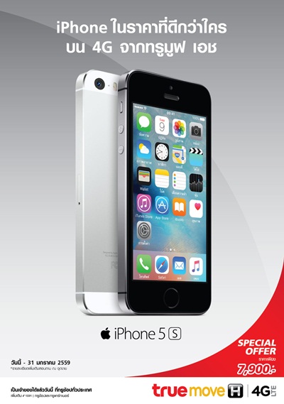 รู้แบบนี้แล้ว ใครที่กำลังมองหาหรือสนใจ iPhone 5S อยู่ละก็คงต้องรีบๆ กันหน่อยนะคะ เพราะว่าโปรโมชั่นนี้ใช้ได้ถึงวันที่ 31 มกราคม 2559 เท่านั้นดูรายละเอียดเพิ่มเติม truemoveh.truecorp.co.thข่าว-โปรโมชั่นล่าสุดอื่นๆ